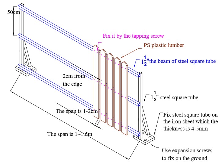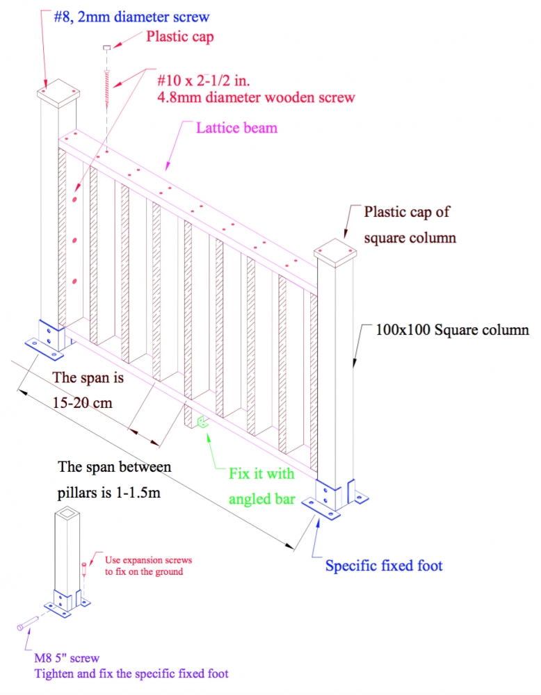 Use the 100x100 square column and the interval between the pillar is around 1m to 1.5m with specific fixed foot. Using the M8×5”screw and nut to fix the square column, then using expansion screws fixed on the ground 【See the picture below】When fixing the screws, you also can use the plastic cap to hide the screws and nuts.