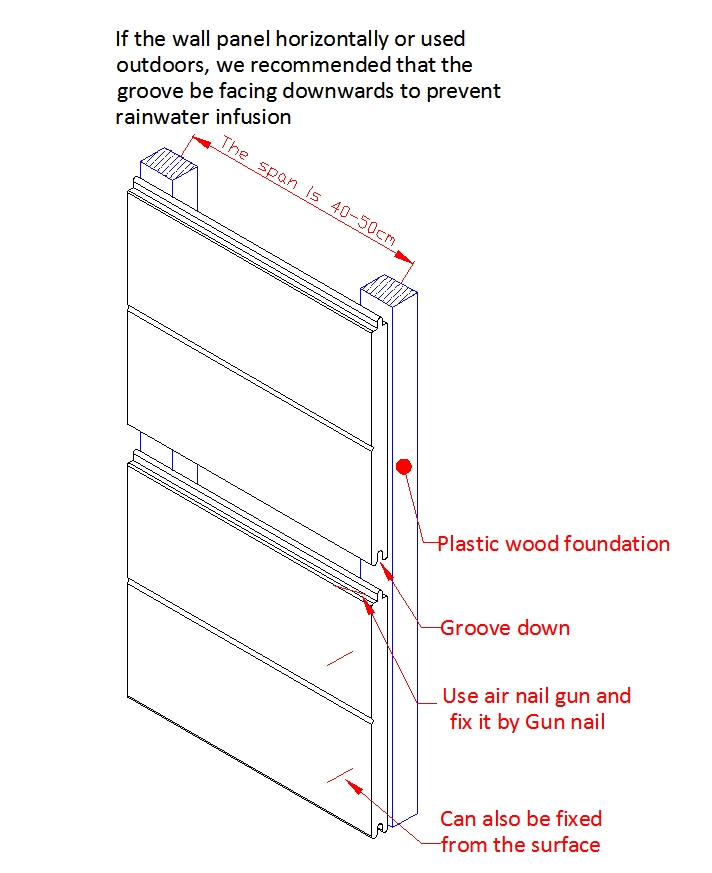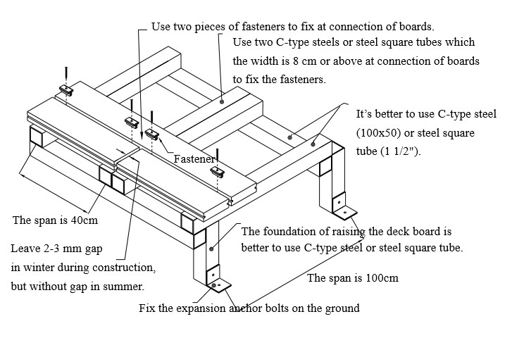 Need to use screws, do not use nail gun or nails to fix. Steel structure base with tapping screw, decking foundation use wood screws; Screw specifications for #8 (diameter is about 4.2 mm), the length of the screw should be 2-3 cm longer than fastener; It needs two pieces of fasteners to fix at connection of boards. Also, it needs to be left 2-3 mm gap in winter, but without the gap in summer.